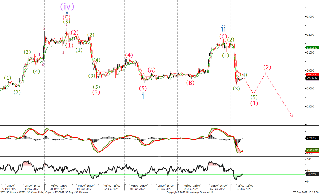 ‘BTC has continued to trade sideways with a low set at $28k. A break there will signify that wave (v) is unfolding to new lows. We would look to buy lower.’