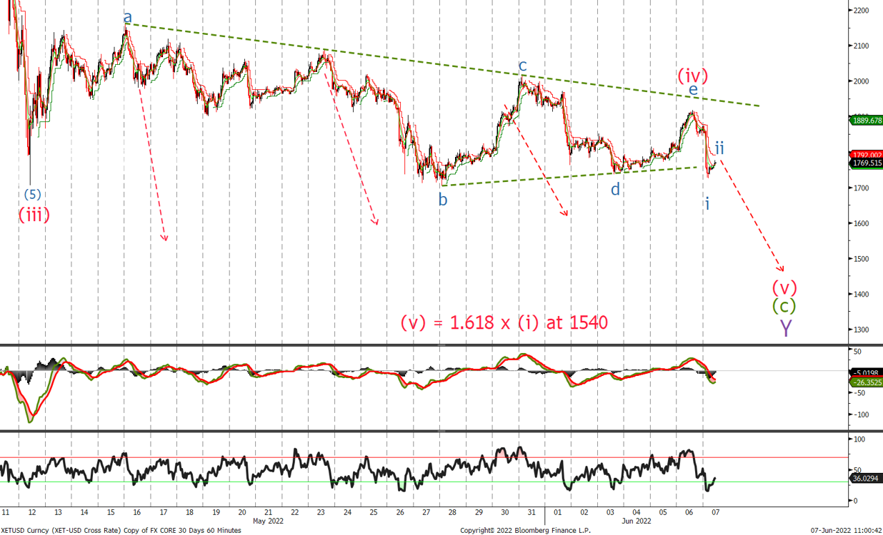 I have changed the count to show a larger wave (iv) triangle playing out, but remain bearish for lower. If long, we would look to sell now and buy back lower or on a move above last week's high of $2'020.