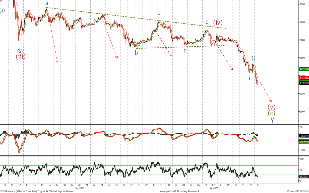 We sold off in line with expectation with an acceleration lower on a break of the $1'704 level. Like BTC, we continue to look for lower in 5 waves to complete the long term correction. I would look to sell at $1'540 area and set stops above $1'780. A move above this level will signal the uptrend has resumed.