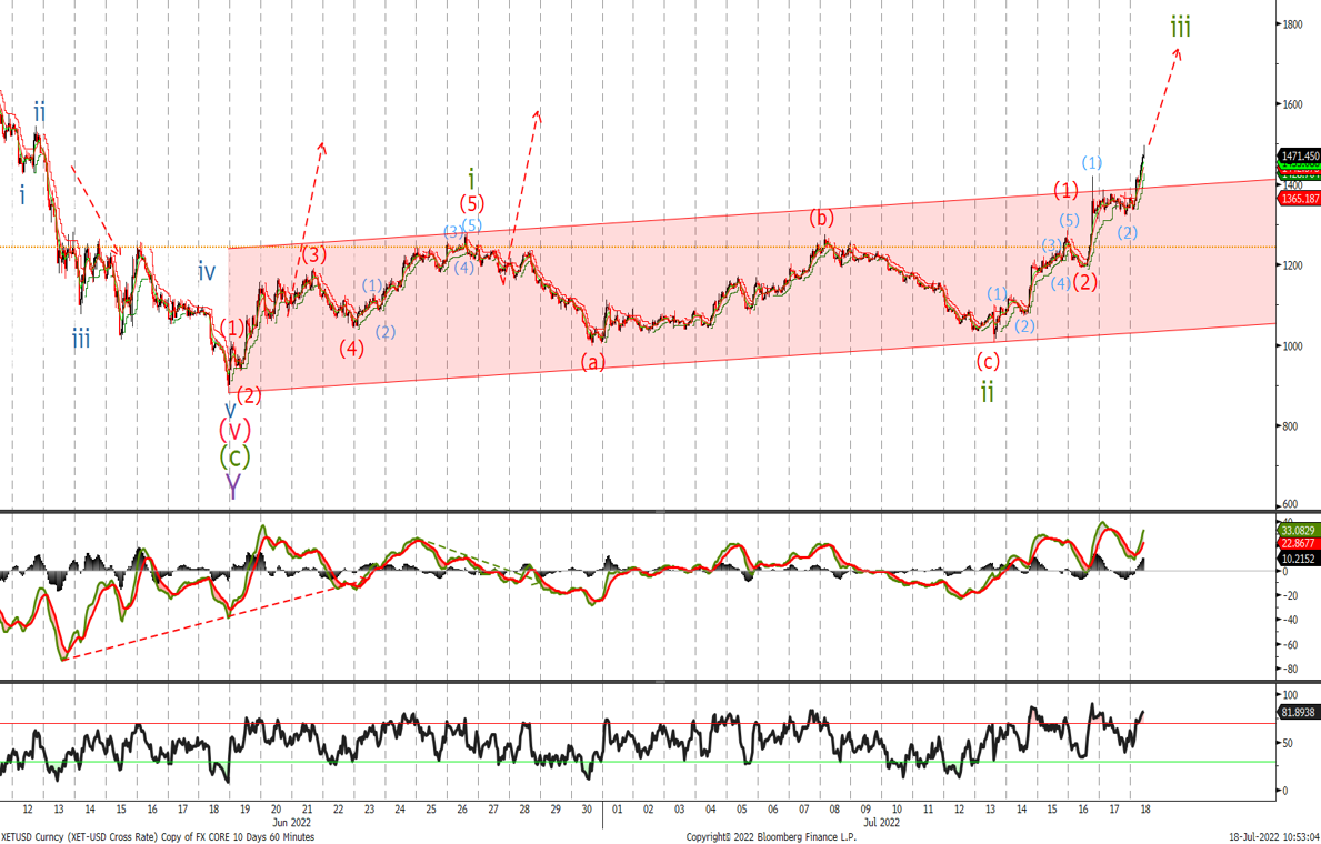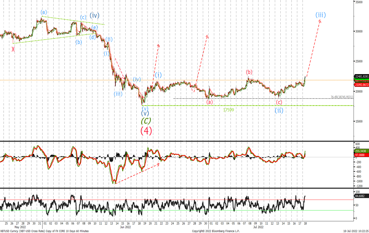 We traded down to $18'632 and then broke the $22k level. The acceleration higher we were expecting looks to be gaining some momentum this morning with next target to the topside that will confirm wave (iii) is underway at $23'590, place stops for half the position now at the wave (ii) low at $18'900 with the remainder staying at $17'599