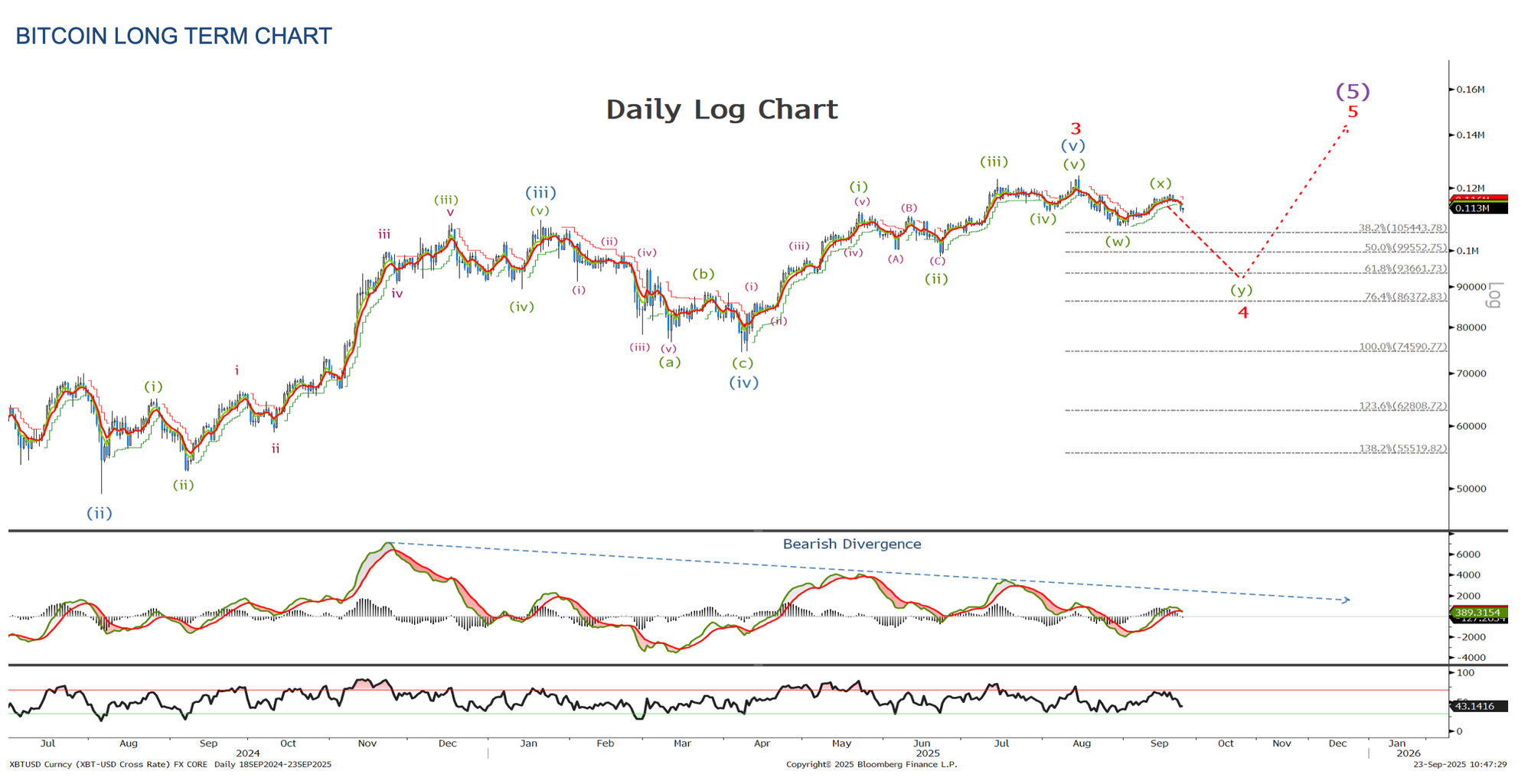 Last time we said ‘We traded to 116760 and it appears we should have one new high above that level before the sell off to to the 86-94K levels. If long I would reduce position here and rebuy on dips.’ We traded up to 117962 making the new high we were looking for and so far it appears we have sold off in 3 waves and are retracing in a minor wave iv.
