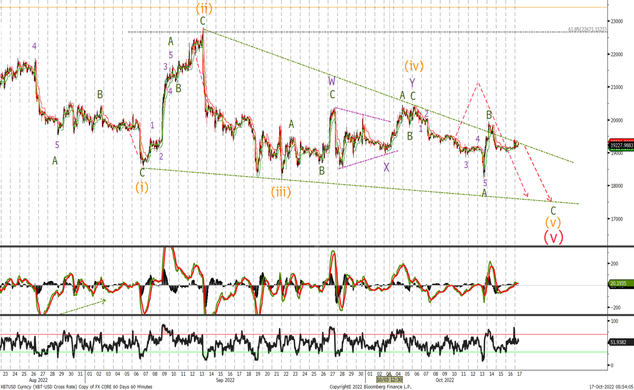 We never saw higher trader down to $1'193 before reversing back up. Although this new low could be counted as the low in ETH I am showing, and prefer a larger corrective triangle playing out and still expect to see a push towards $1'000 before a long term low is in place. A move back above $1'565 would be the first signs a low is in place.