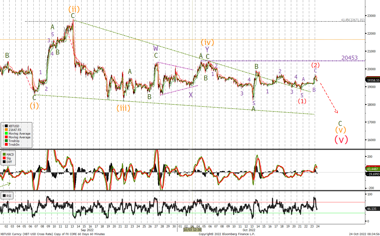 Not much change from last weeks view as we await a sell off towards the $17'500 level. This corrective rally should end below $20'453 and we would look to sell on any rallies whilst below that level. A move back above $22'800 will signal a low is in place for BTC.