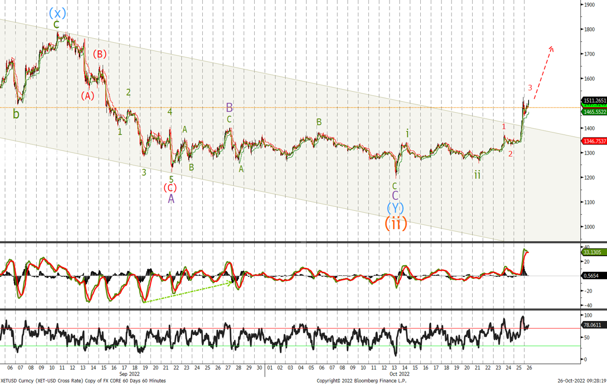 With a high so far of $1'530 we haven’t broken the level but given the impulsive break out of the trend channel I have updated the charts to show the more bullish view that calls the October low at $1'193 the end of the correction and wave (ii). If correct we should see the ETH accelerate quickly to the topside with next target once $1'565 broken a break above $1'800.