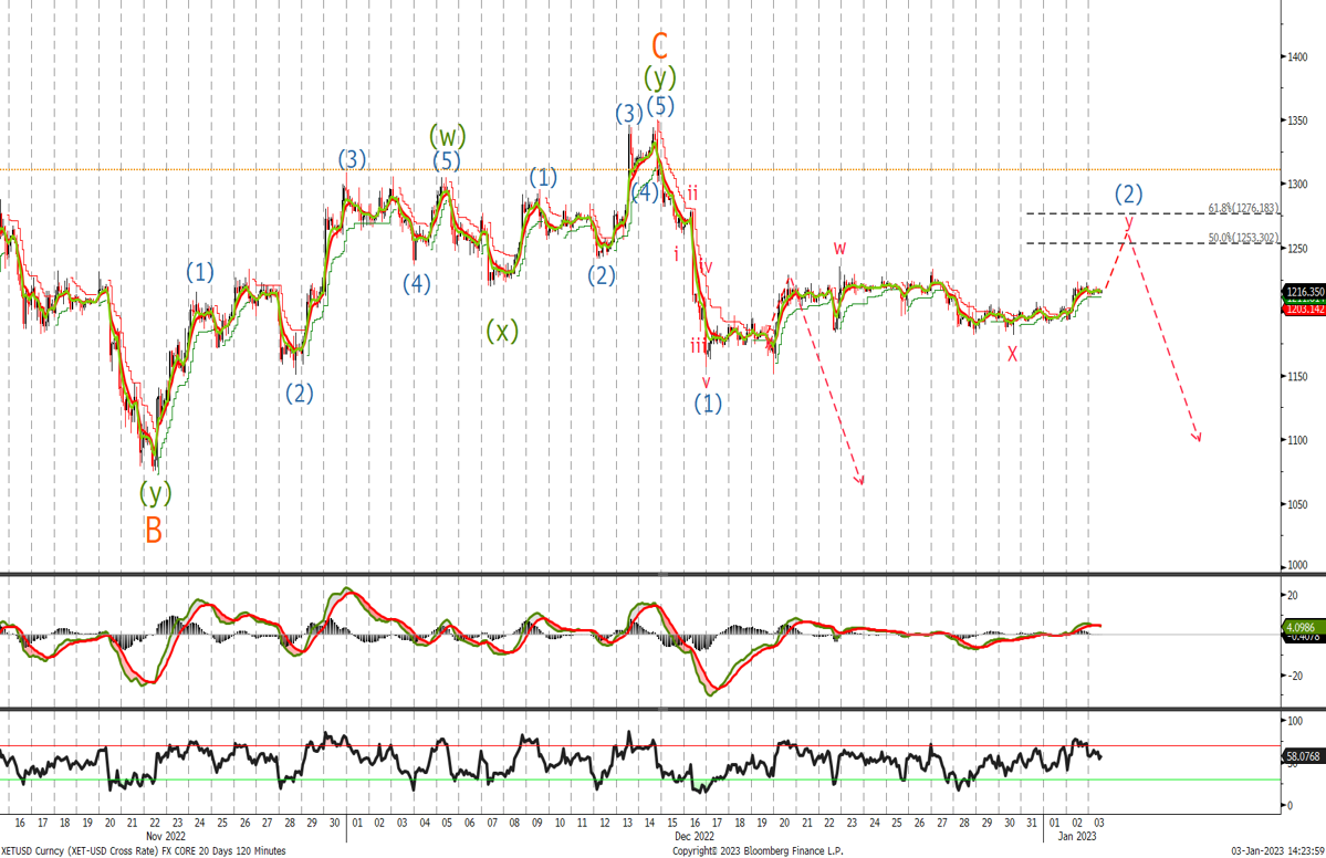 We traded to $1'235 before trading back to $1'180. Given the tight range I believe we will have another leg higher to complete the correction above the $1'235 high. Look to sell in the $1'250/$1'276 area with stops above $1'360. As the last update a close below $1'150 should confirm wave (3) lower is underway and see an acceleration to the downside.