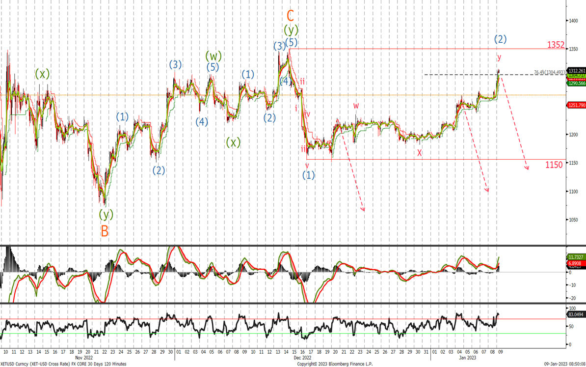 ‘Given the tight range I believe we will have another leg higher to complete the correction above the 1235 high. Look to sell in the 1250/1276 area with stops above 1360. As the last update a close below 1150 should confirm wave (3) lower is underway and see an acceleration to the downside.’
