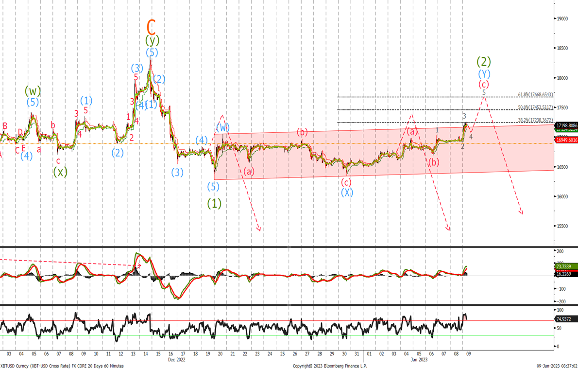 This morning we traded to 17250 enabling us to sell , however looking at the short term count it looks like we should have one more new high in the 17450-17668 area where we would add to shorts with stops remaining at last weeks level.