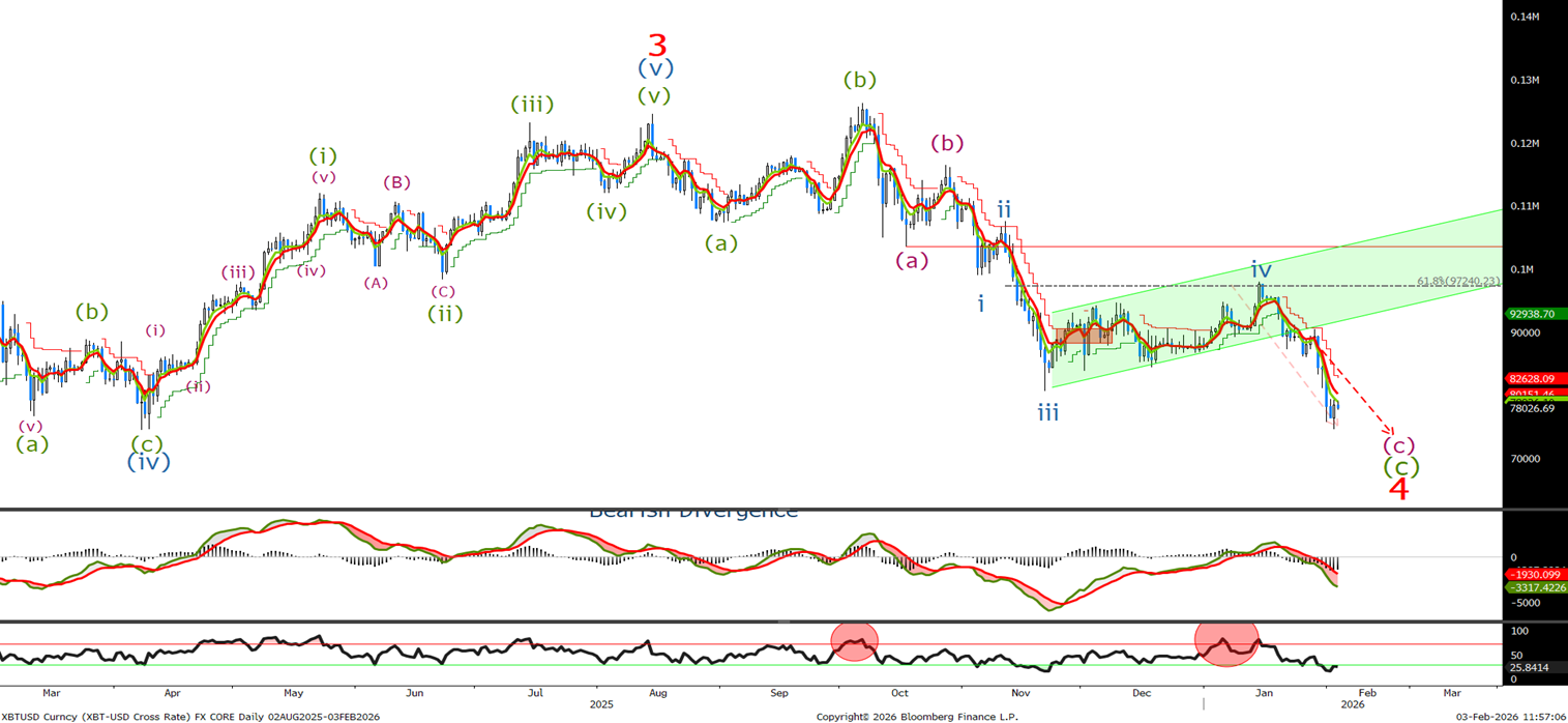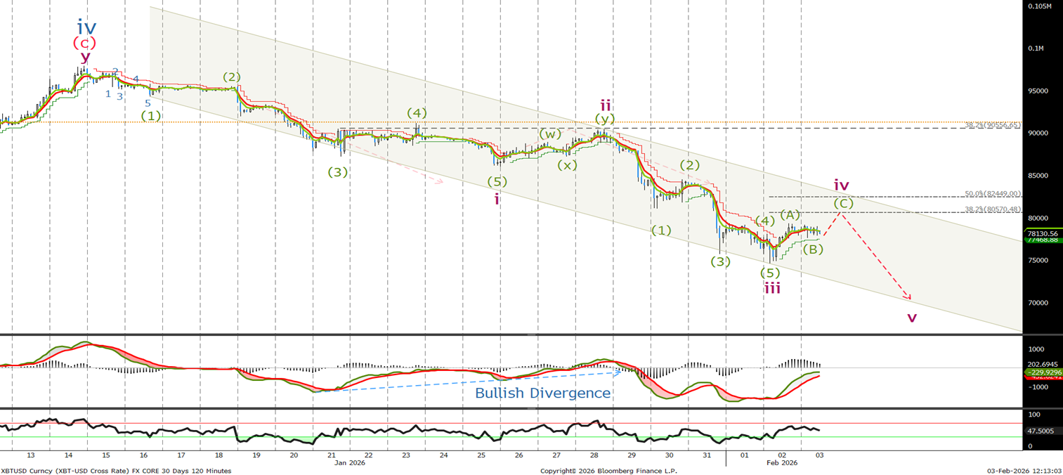 I haven’t updated the last chart because I said ‘Look for an acceleration on a break-out the channel. The next target to the downside is the wave iii low at 80553 followed by 76000.’ Yesterday's low was 74540 just below our initial target. So we need to look to the short-term chart for any signs that the sell-off is complete.