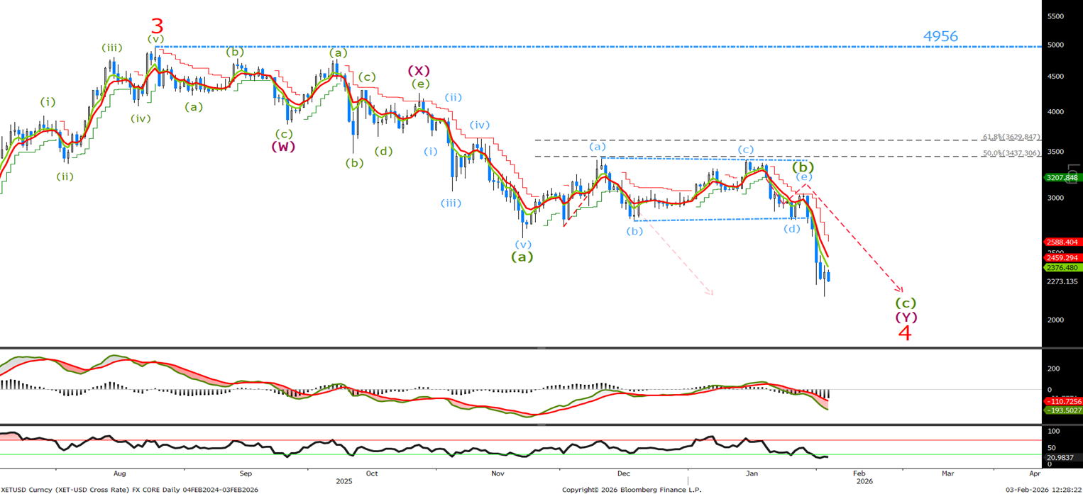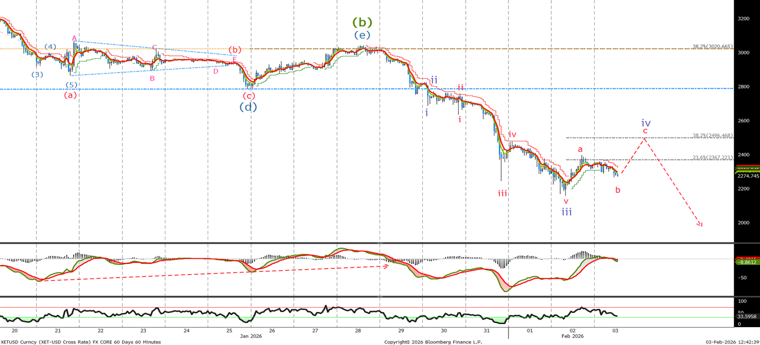 Last time I said ‘I am looking for a zigzag rally toward the retracement levels to complete wave (e) before the sell-off resumes. Look to sell at 3020-3090-3165 with stops above 3445.’ We traded to 3036 enabling us to sell and since then we have sold off in 3 waves. Looking at the divergence in the MACD we expect another leg higher towards the 2480-2520 area before the sell off resumes. A move back above 2800 would negate this current view.