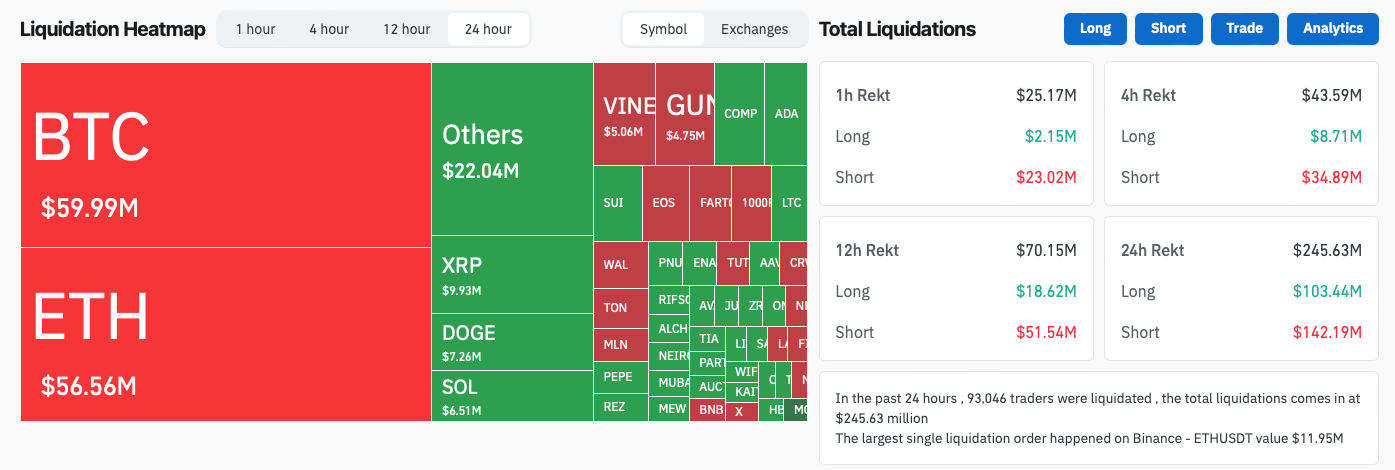 In the past 24 hours, crypto liquidations came in at $245.63m, with 58% of them short positions.