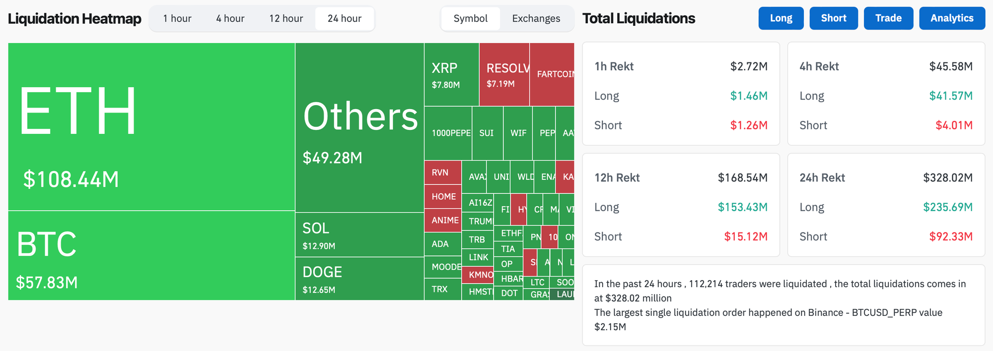 - In the past 24 hours, crypto liquidations increased 7.5% and totaled $328m, with almost 72% of them long positions. ETH positions made up 33% of all liquidated positions.