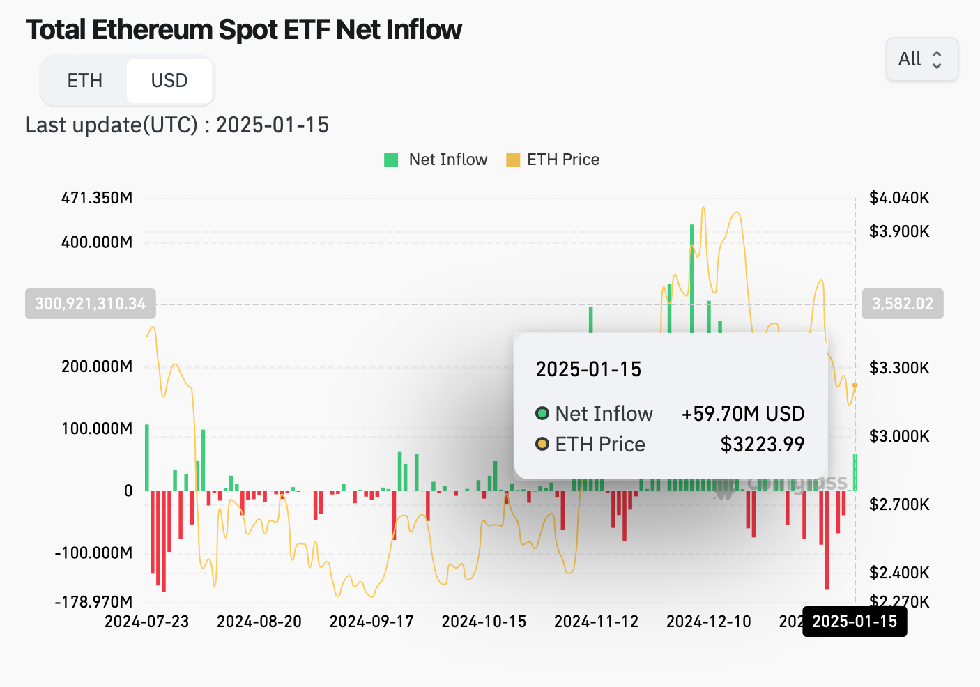 US Bitcoin Spot ETFs reversed their trend, recording significant net inflows of $755.1 million following four consecutive trading sessions of net outflows. US ETH Spot ETFs also recorded a daily net inflow of $59.7m.