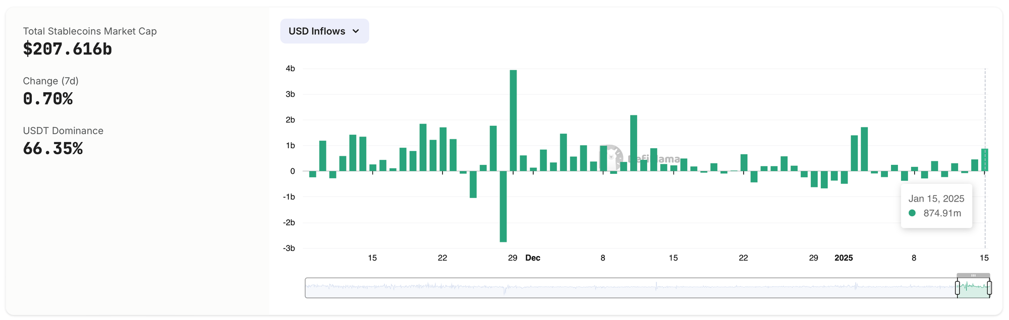 The total volume in DeFi is currently $9.68 bn, representing 6.13% of the total crypto market 24-hour volume. The volume of all stable coins is at $143.95 bn, which is 91.09% of the total crypto market 24-hour volume. The stablecoin markets recorded almost double the USD inflows on Jan 15 than they did on Jan 14.