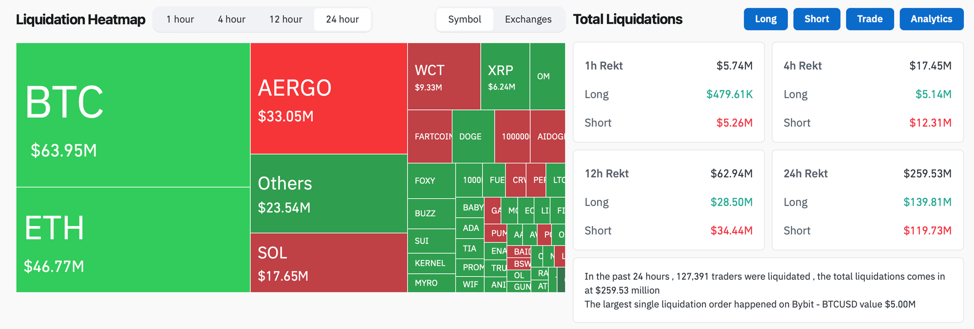 In the past 24 hours, crypto liquidations increased by 16% and totaled $259.5m, with 54% of them long positions.