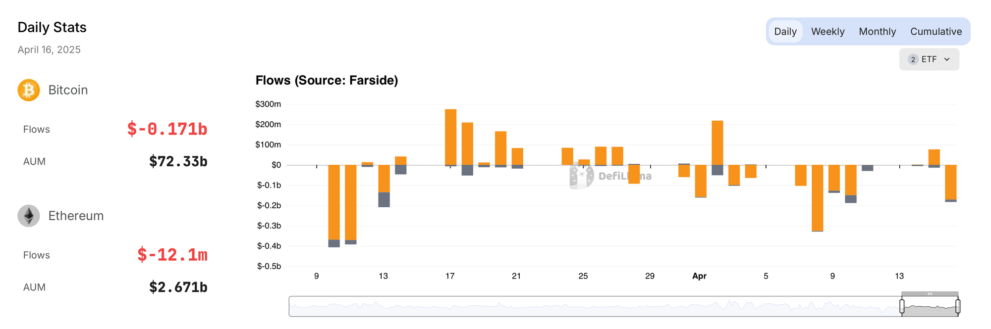 According to data from Farside Investors, US Bitcoin spot ETFs saw mixed flows on April 16, 2025, with total net outflows of $171.1 million. While funds like IBIT (+$30.6m), BITB (+$12.8m), BTCO (+$6.7m), HODL (+$2.4m), and BTC (+$3.4m) recorded modest inflows, these were outweighed by sharp outflows from FBTC (-$113.8m) and ARKB (-$113.2m), marking a day of uneven sentiment across issuers. US Ethereum spot ETFs posted net outflows of $12.1 million. Grayscale’s ETHE led the redemptions with $8.2 million in outflows, followed by BlackRock’s ETHA (-$4.3m) and Franklin’s EZET (-$1.8m). Meanwhile, Grayscale's ETH fund recorded $2.2 million in inflows, though this was not enough to offset the broader negative flows.