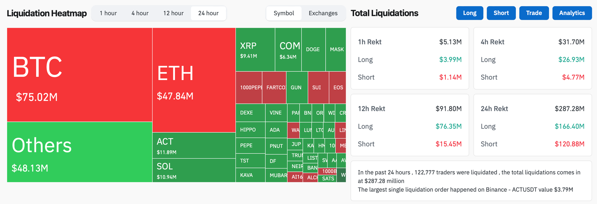 In the past 24 hours, crypto liquidations came in at $287.28m, with 58% of them long positions.
