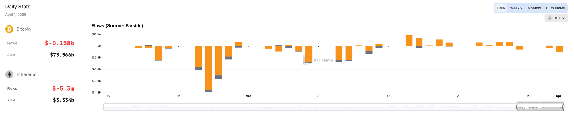 According to data from Farside Investors, both US BTC and ETH spot ETFs ended yesterday's trading session with net outflows. Despite Bitwise BITB and Franklin EZBC recording net inflows of $24.5m and $7.4m respectively, Ark ARKB, Fidelity FBTC, Grayscale GBTC and WTree BTCW recorded significant net outflows of $87.4m, $85.4m, $10.1m and $6.8m, resulting in a daily net outflow of $157.8m, 160% higher than the previous day's outflows. ETH ETFs recorded net outflows of $5.3m, with $2.7m flowing out of Grayscale ETH and $2.6m out of Bitwise ETHW.