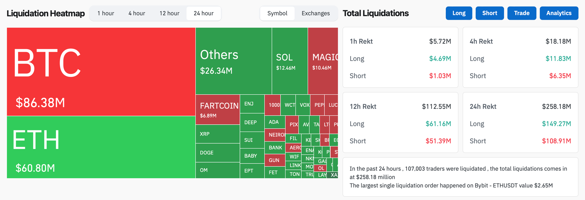 In the past 24 hours, crypto liquidations increased by 20% and totaled $258.2m, with 58% of them long positions.