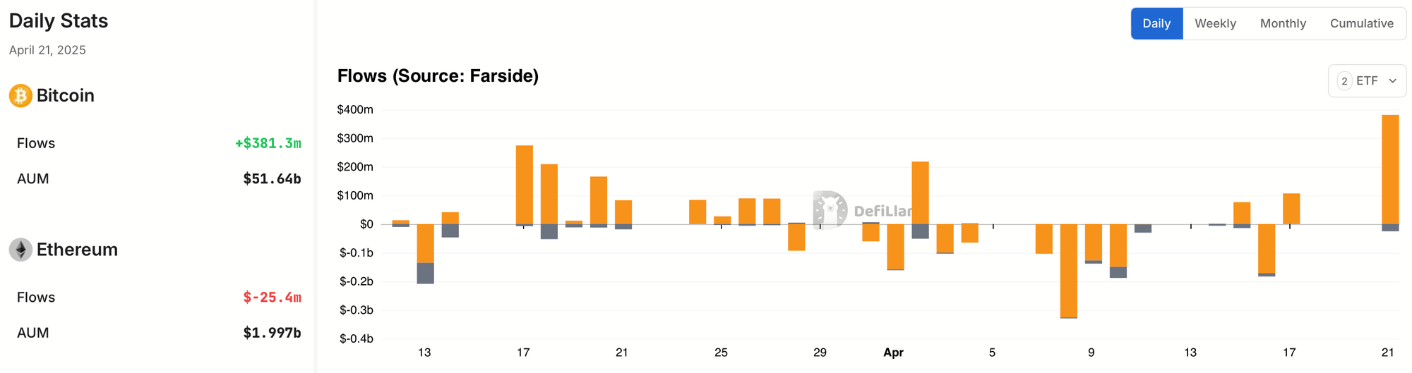 According to data from Farside Investors, U.S. Bitcoin spot ETFs saw strong inflows on April 21, 2025, totaling $381.3 million. ARKB led the gains with $116.1 million in net inflows, followed by FBTC (+$87.6m), BITB (+$45.1m), IBIT (+$41.6m), and GBTC (+$36.6m). Other funds also contributed positively, including HODL (+$11.7m), EZBC (+$10.1m), and BTC (+$32.5m), reflecting renewed investor confidence across the sector. US Ethereum spot ETFs posted net outflows of $25.4 million, entirely driven by Grayscale’s ETHE product. All other issuers reported no activity for the day.