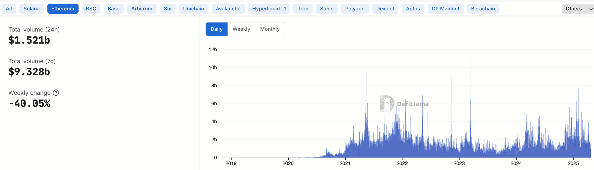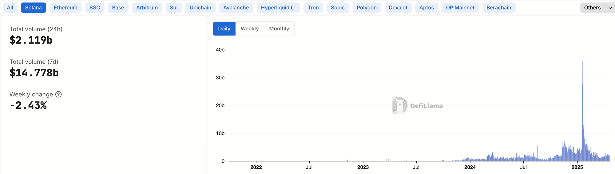 Solana’s decentralized exchanges (DEXs) are outpacing Ethereum’s in trading activity, with 24-hour volume currently nearly 40% higher. This trend is even more pronounced on the weekly timeframe, where Solana’s DEX volume over the past 7 days is now 58% greater than Ethereum’s.
