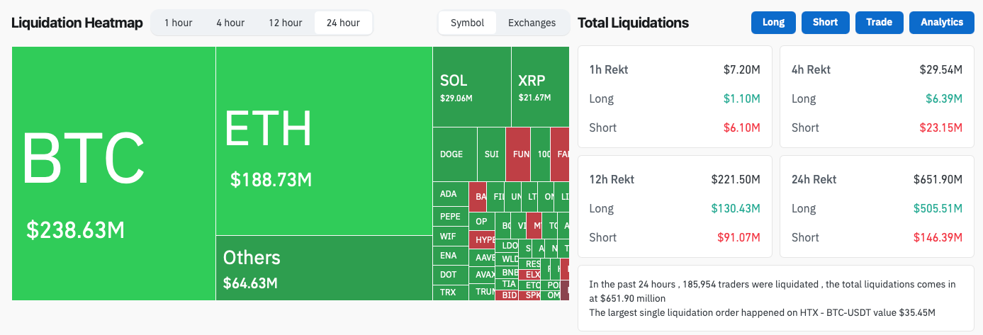 - In the past 24 hours, crypto liquidations decreased 4% and totaled $652m, with 77.5% of them long positions. BTC positions made up over 36% of all liquidated positions.