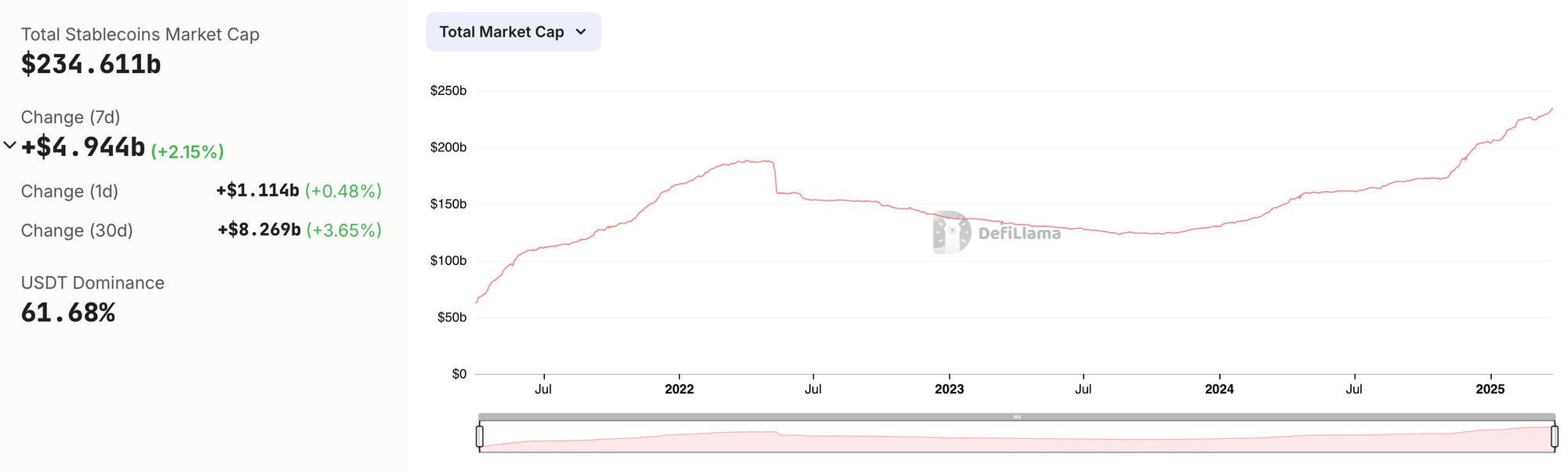 The stablecoin market cap increased 3.65% over the past month and is currently at $234.611bn. USDC stablecoin supply reached a new all-time high above $60 billion: USDC now has a 25.4% share of stablecoin market cap vs 20.7% at the start of the year.