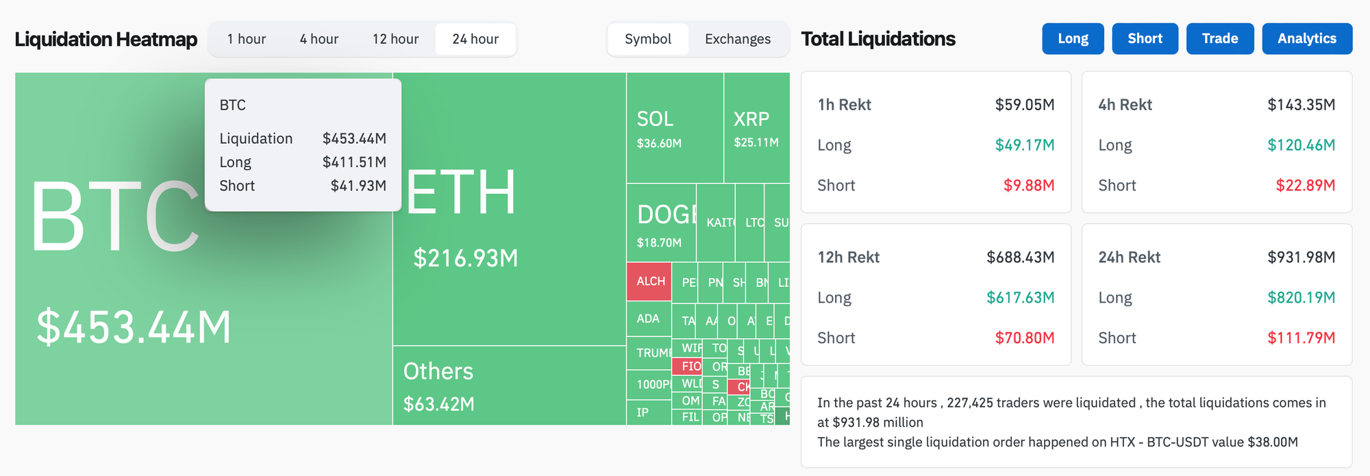 Crypto liquidations came in at $930.17m over the past 24 hours, with 44% of them (worth $411.51m) BTC long positions and 19.9% of them (worth $184.90m) ETH long positions.