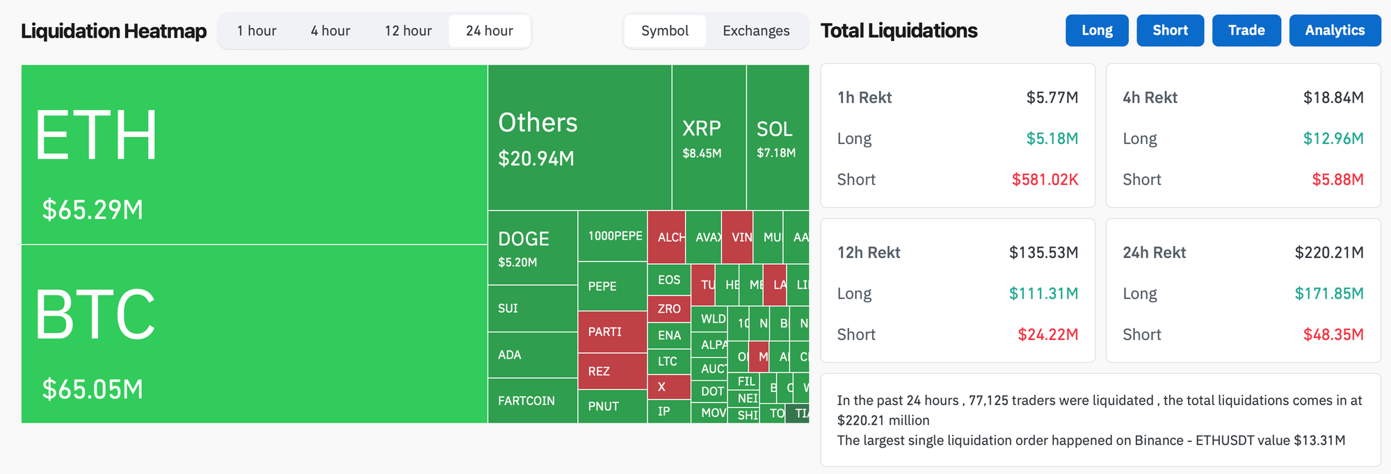 In the past 24 hours, crypto liquidations came in at $220.21m, a 25% decrease compared to 24 hours prior, with 78% of them long positions. ETH positions lead the market, making up almost 30% of all liquidated positions. According to data from Coinglass, liquidations for March 29 and March 30 combined reached $531m.
