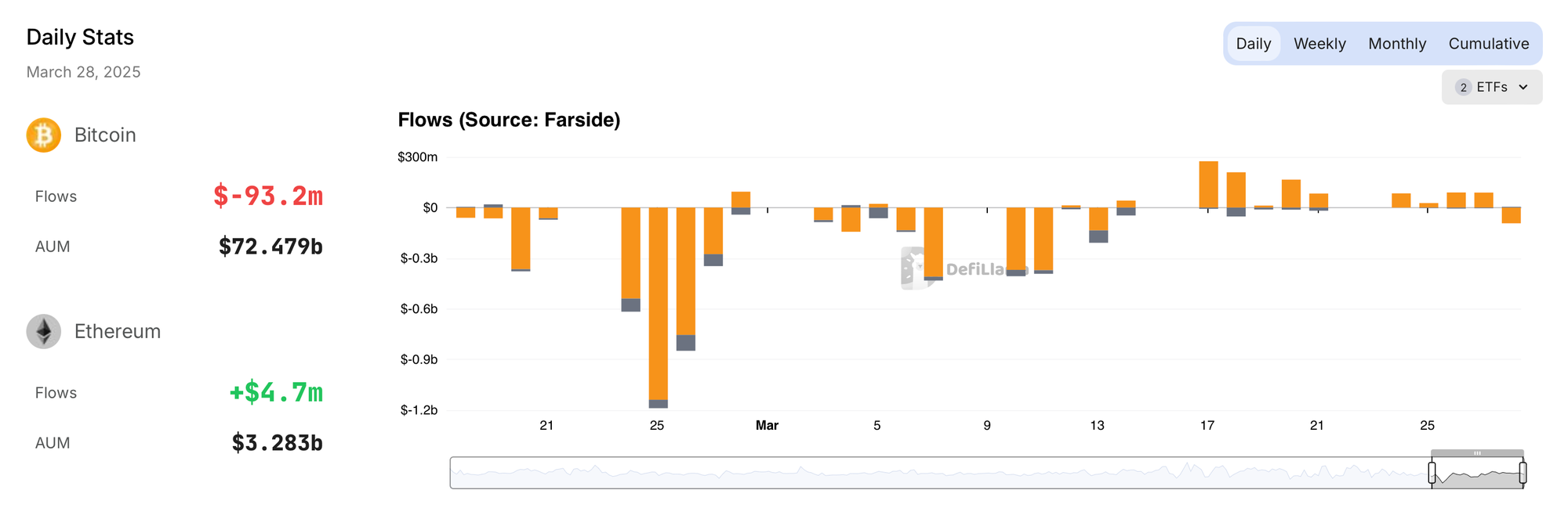 According to data from Farside Investors, US BTC spot ETFs reversed their course on March 28, recoding a daily net outflow of $93.2m. ETH ETFs also ended their 16 day outflow streak, recording a ouflow of $4.7m, which all went into ETHE.