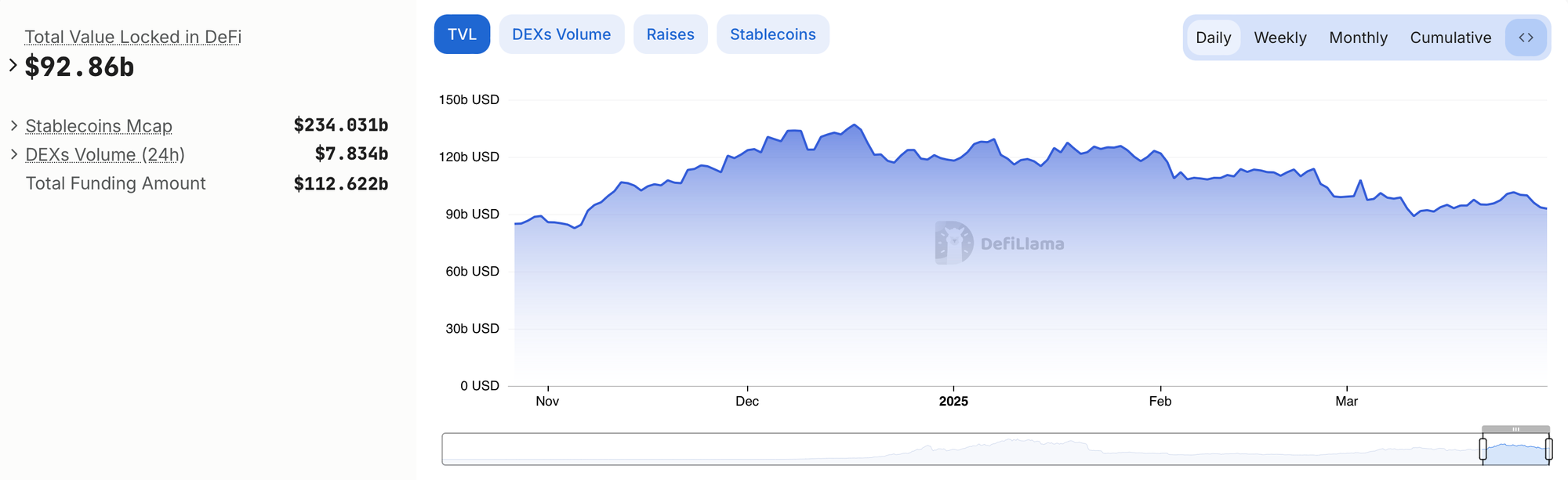 The total value locked in DeFi decreased to $92.86bn, dropping 7% between March 28 and today, while the stablecoin market cap is almost unchanged at $234bn.