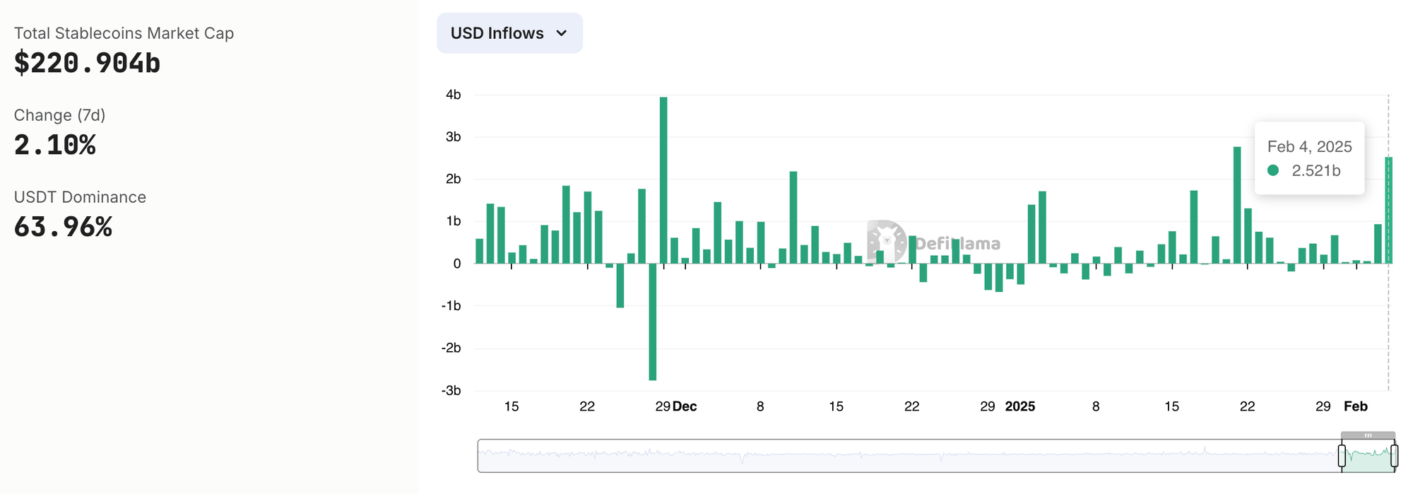 Stablecoins saw daily inflows of $2.521bn on Feb 4. The current market cap is $220.904bn.