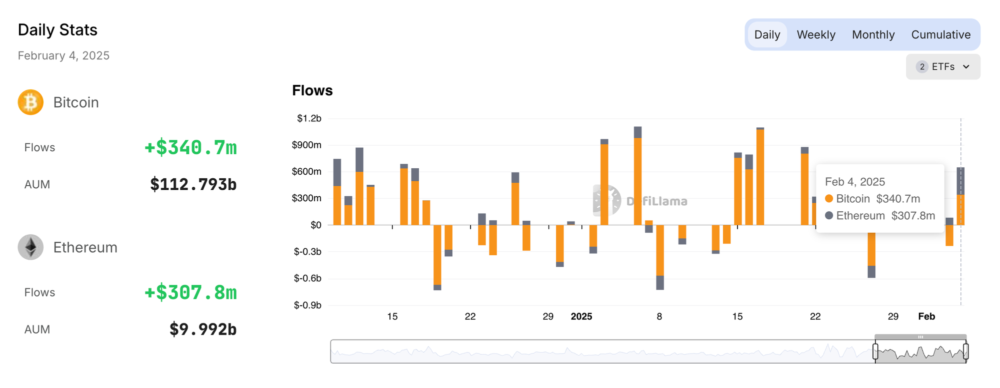 US BTC and ETH Spot ETFs recorded net daily inflows of over $300m each on Feb 4. For BTC ETFs, this is a reversal from the previous day's net outflows, while for ETH, the $307.8m inflows represent a 268% increase compared to one day prior.