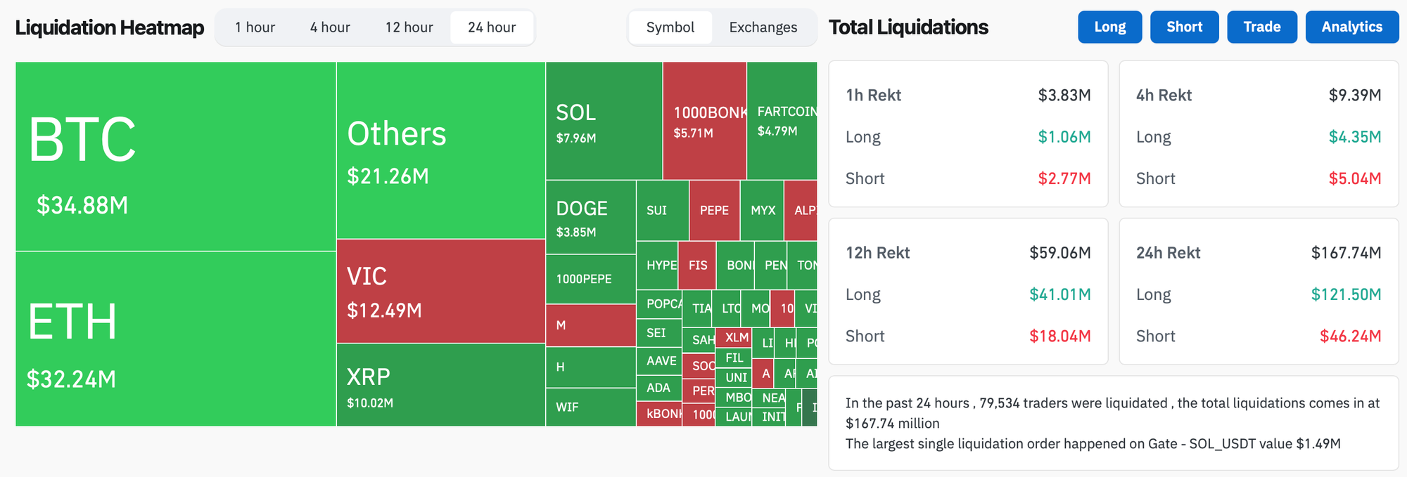 - In the past 24 hours, crypto liquidations decreased by 7% and totaled $167.74m, with 72% of them long positions.