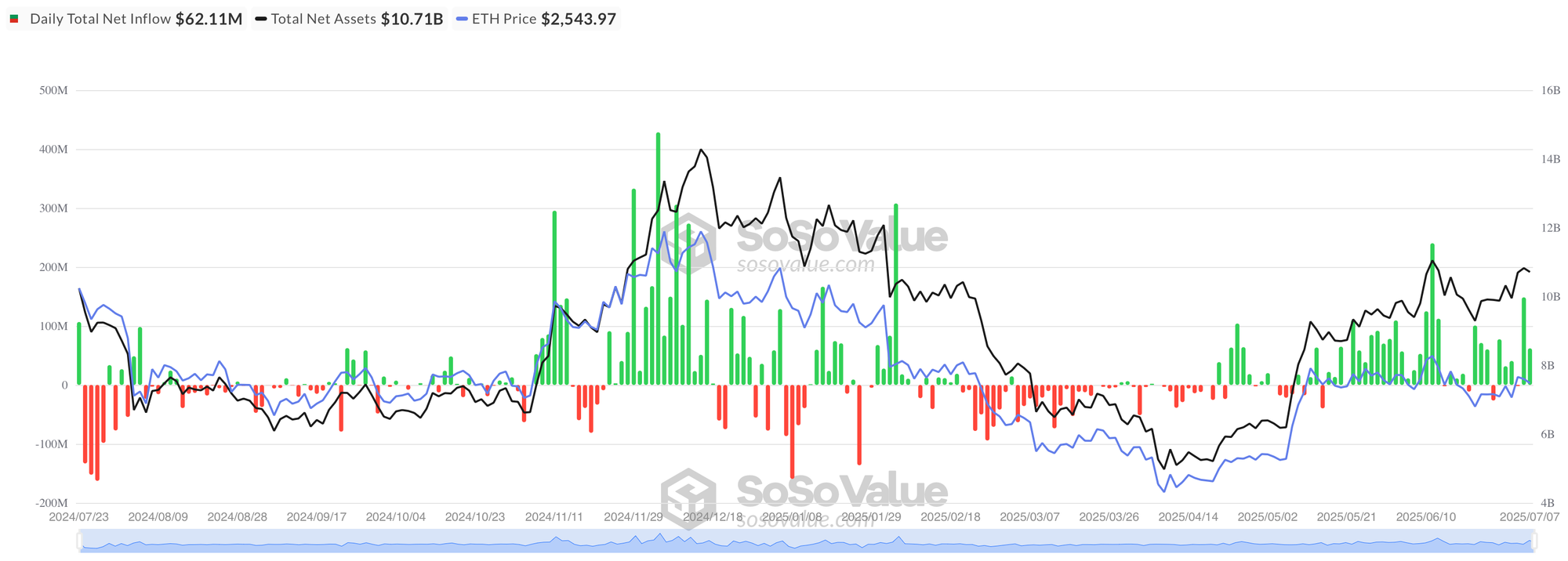- According to data from SoSo Value, Ethereum ETFs recorded $62.1 million in net inflows on July 7, moderating from the $148.6 million recorded on July 3. BlackRock's ETHA dominated with $53.2 million in inflows while Fidelity's FETH contributed $8.9 million, as both Grayscale products—ETHE and ETH—recorded zero flows for the day. All Ethereum ETFs declined between 1.15% and 1.25%, with total assets falling to $10.7 billion while cumulative net inflows reached $4.46 billion since launch. Trading volume decreased to $397.2 million from recent higher levels, with the inflows bringing the month-to-date total to over $250 million across the first three trading days of July.