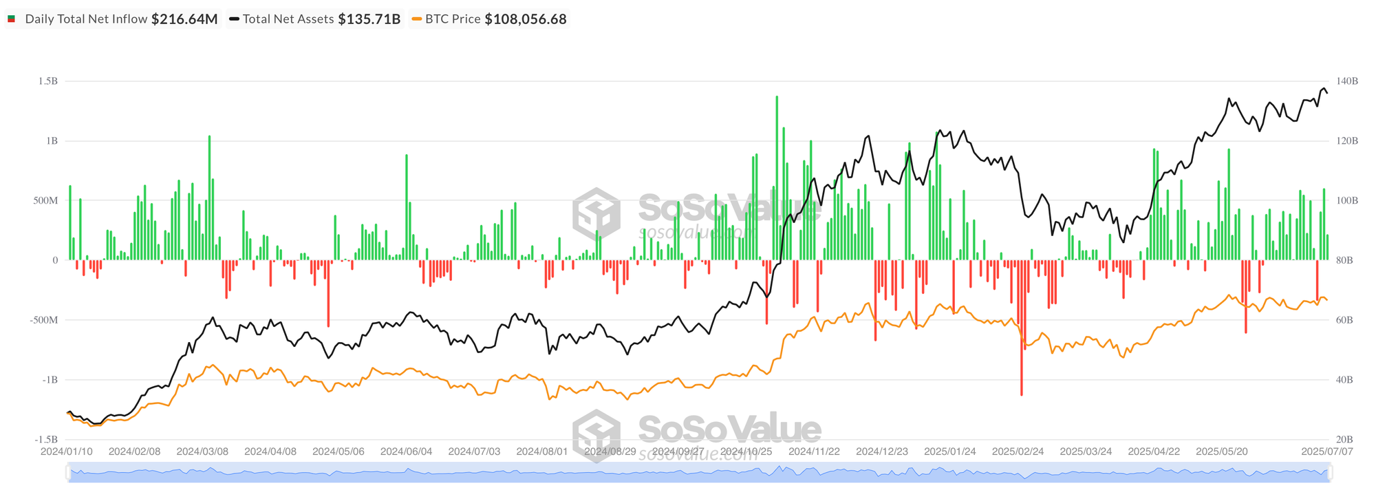 - According to data from SoSo Value, Bitcoin ETFs recorded $216.6 million in net inflows on July 7, maintaining positive institutional demand despite a more moderate pace compared to recent days. BlackRock's IBIT dominated with $164.6 million in inflows while Fidelity's FBTC contributed $66.1 million, together accounting for over 100% of the day's total as Grayscale's GBTC posted $10.2 million in outflows and Ark's ARKB saw $10.1 million in redemptions. All Bitcoin ETFs declined around 1.2% as the cryptocurrency pulled back, with total assets falling to $135.7 billion while cumulative net inflows reached $49.9 billion since launch. The solid but measured inflows suggest institutional appetite remains strong but more selective, with the ETFs having attracted over $1.2 billion across the first three trading days of July despite experiencing some selling pressure.