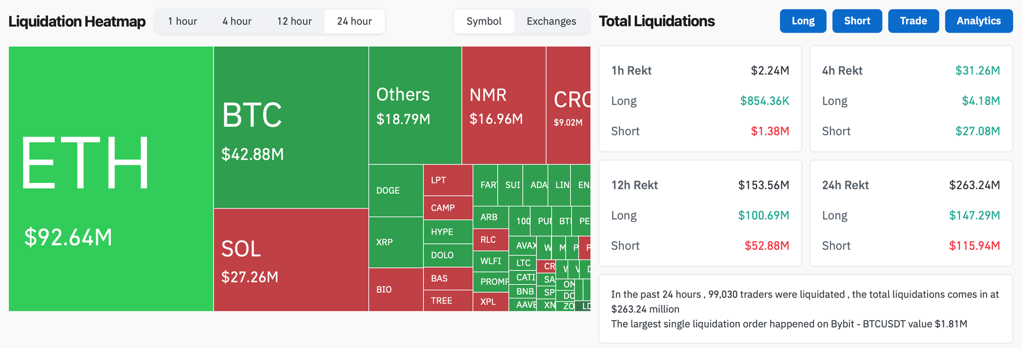 - In the past 24 hours, crypto liquidations totaled $263.24m, with 56% of them long positions.