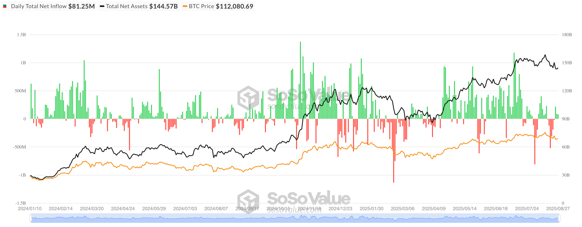 - According to SoSo Value data, US Spot BTC ETFs recorded a third consecutive session of daily net inflows on Aug 27, totaling of $81.25m.