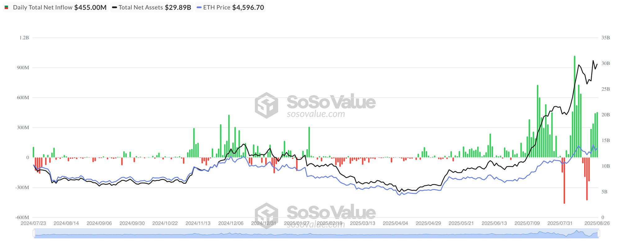 - According to data from SoSo Value, US Spot ETH ETFs recorded a $307.2m daily net inflow on Aug 27. Despite it being almost 4x higher than BTC ETF inflows for the same day, it still marks a 32.5% decrease from the previous day's $455m inflows.