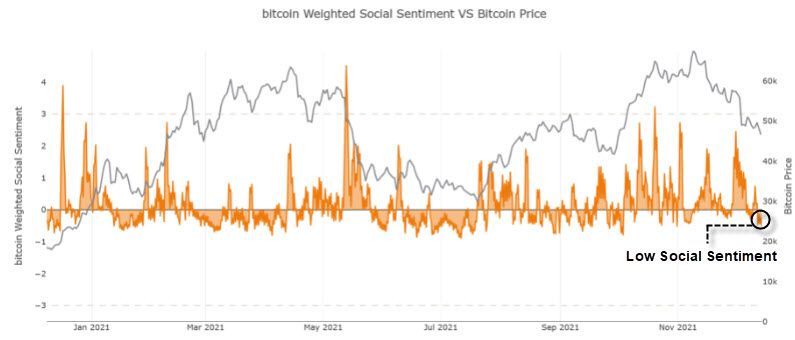 Average social sentiment is at a monthly low, suggesting low investor confidence in Bitcoin price for the end of year