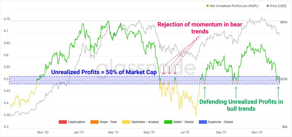 The NUPL is a useful tool to gauge market direction in a spot driven market. Historically, a key level in determining market direction has been the 50 % NUPL level.
