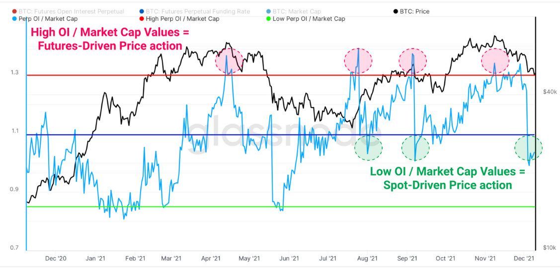 A useful tool for identifiying the transition between a derivatives led market and a spot led market structure is to look at the the proportion of 'Perpetual Futures Open Interest' within the total Market Cap.
