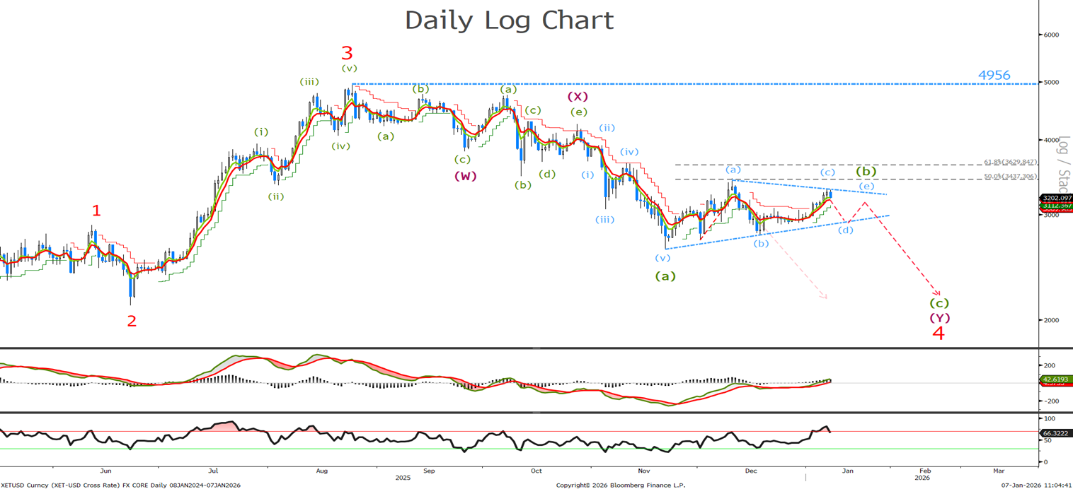 Last time I said ‘We have sold at 3240 and if not short sell now at 3160 with stops above 3700 for a push below 2500.’ As previously mentioned it appears we are tracing out a triangle , if not short sell now at 3106 and lower stops loss levels above the wave (a) at 3450. A move above may signify a larger zigzag correction is playing out. Trading above 3700 will necessitate a change in the view and could signal the bullish trend has resumed.