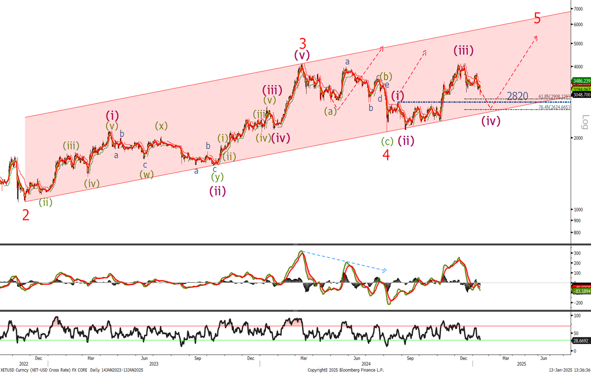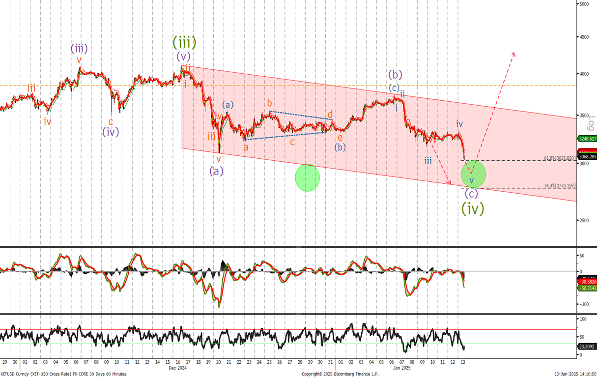 Last time we said ‘I will use any pullbacks in to the 2895-3025 area to add to longs. Raise stops to 2325 level now expecting much higher in the coming months.’ Remain long and buy on dips. I am showing the daily log chart and its is clear that we are correcting before the final wave (v) of wave 5. Once wave 4 is complete we should see a sharp acceleration to the topside and new highs. It is not possible to predict the top but we will count the wave up and give you a head up when it looks close to completion. Lets look at the hourly to see if wave 4 is close to ending.