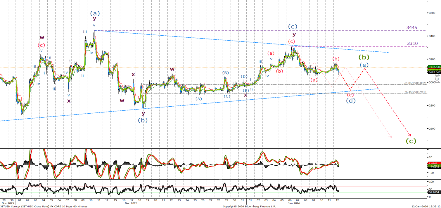 Last time I said ‘it appears we are tracing out a corrective triangle that should turn from below 3450 with confirmation that wave C is underway on a break below 2774. A move above 3450 will target 3629 and we would sell there with stops remaining at 3827.’ No change in our long term view. Lets look to the short term to see where in wave (d) we are.