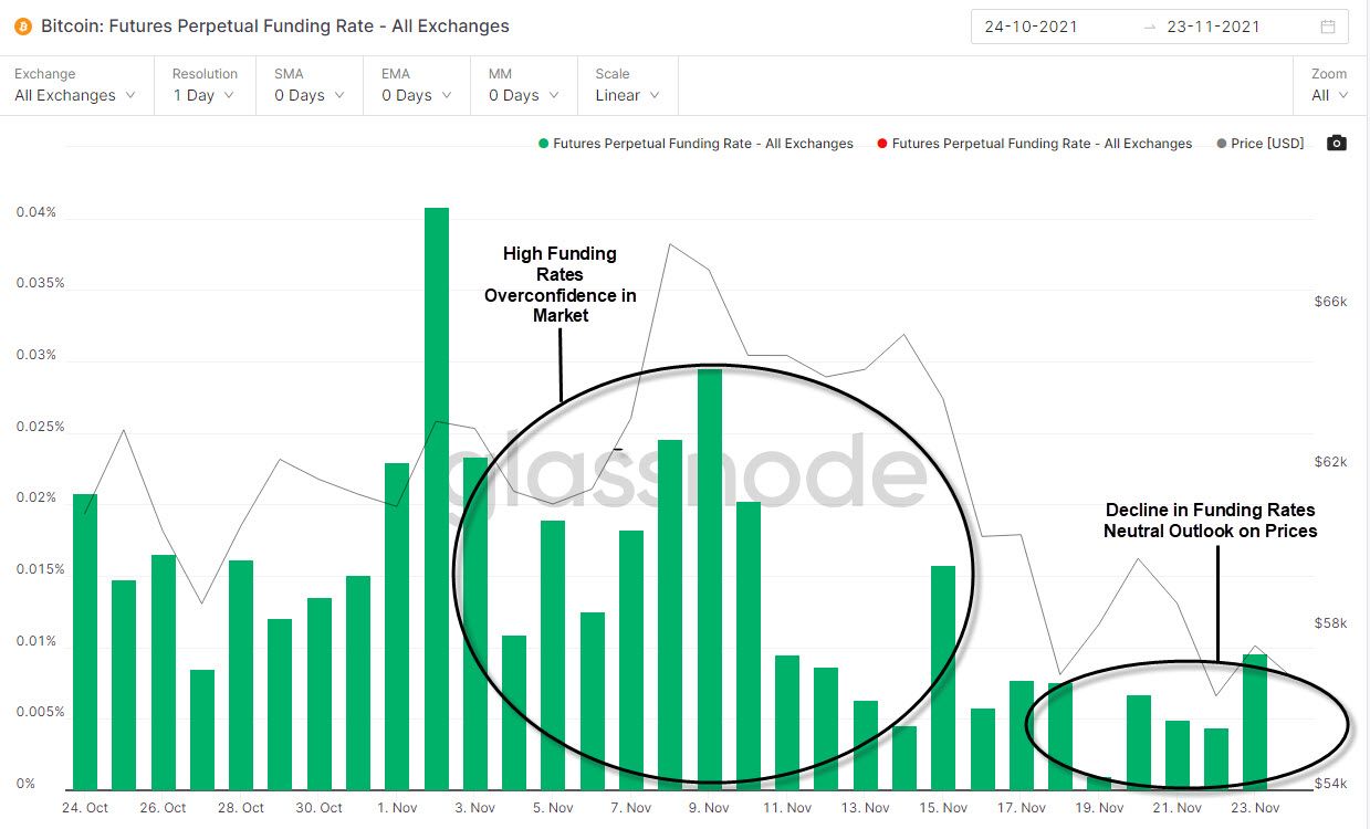 This aligns with the sentiment observed on social networks and confirms the uncertainty present in the market. Similar to social sentiment, high funding rates are signs of price tops or periods of price consolidation. Current neutral levels therefore may indicate that the current $56k level truly is a support zone.