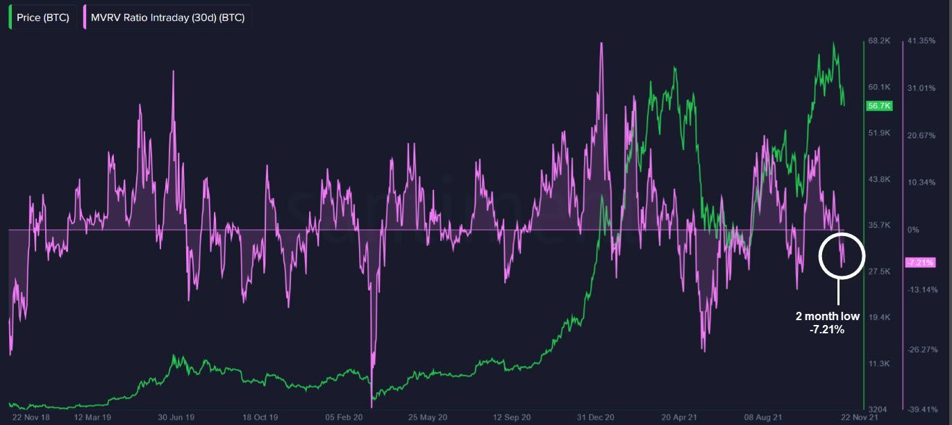 The 30d MVRV ratio tracks the average profit or loss of all addresses that have acquired Bitcoin in the previous 30 days. The ratio is at a two-month low of -7.21%, meaning that the average P/L of coins acquired in the last 30 days is -7.21%.