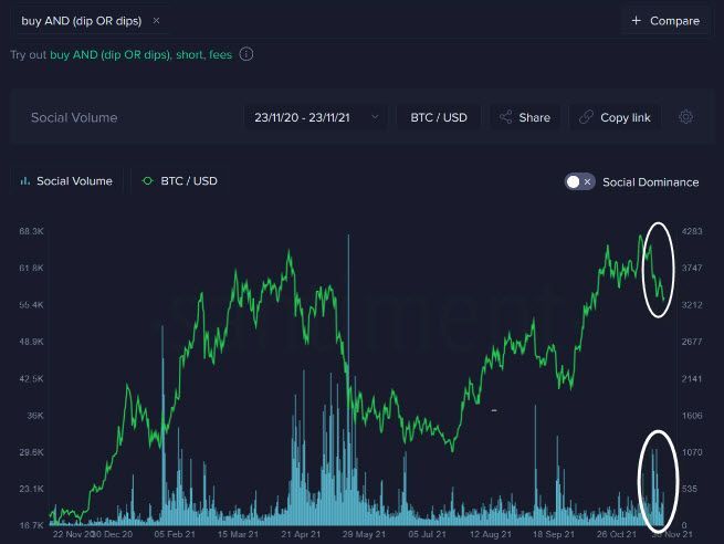 We can confirm the anxiety in the market by viewing the amount of ‘buy the dip’ mentions collected from crypto social media in the past week. While the initial correction on November 15th saw the mentions soar to a 2-month high, the second pullback has yet to prompt an equally confident crowd response.