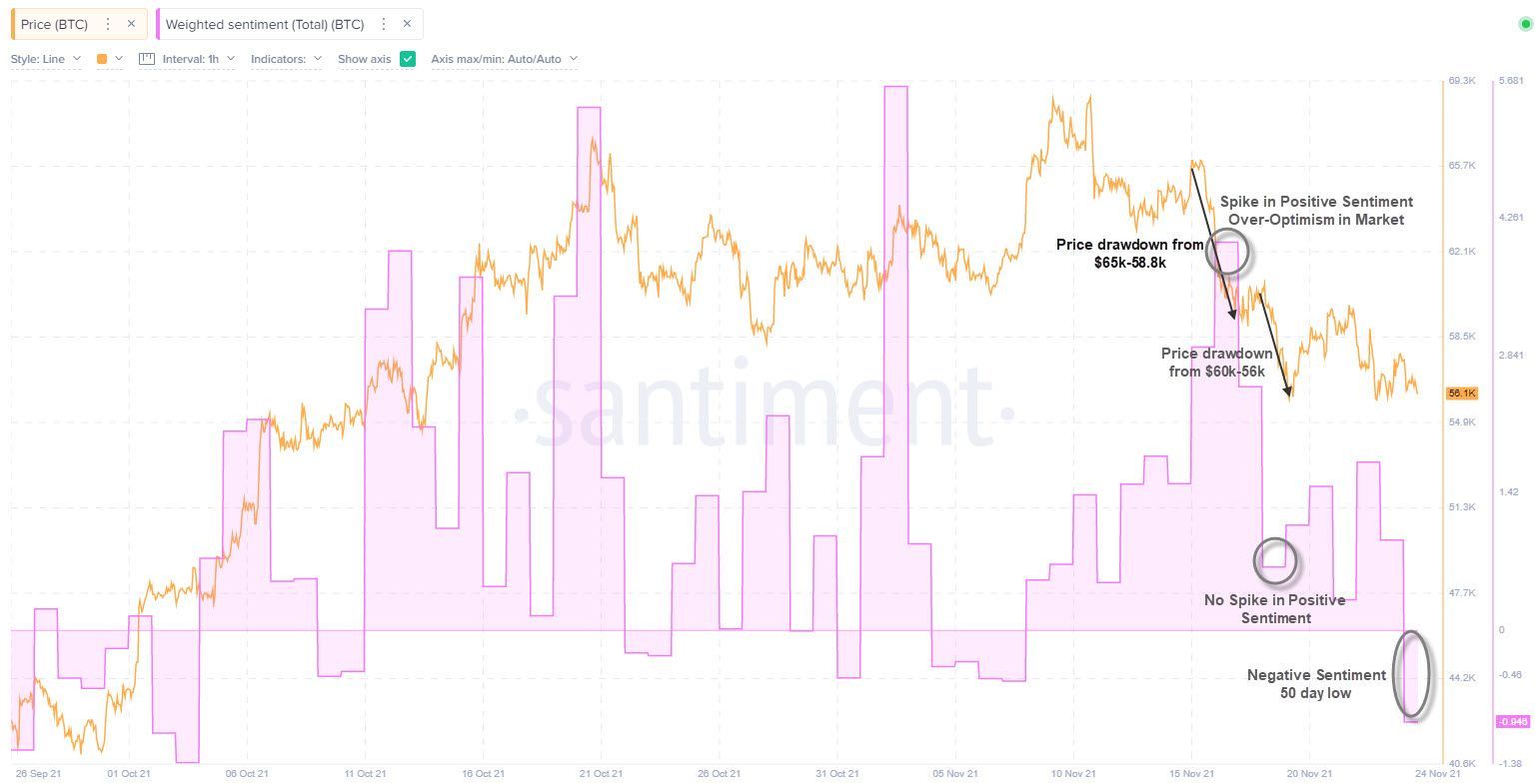 The same didn't occur with the most recent dip from $60k-56k as weighted market sentiment didn't spike as investors were less confident in a swift price recovery this time. Sentiment on Bitcoin has since continued to decline and is now currently at a 50-day low.