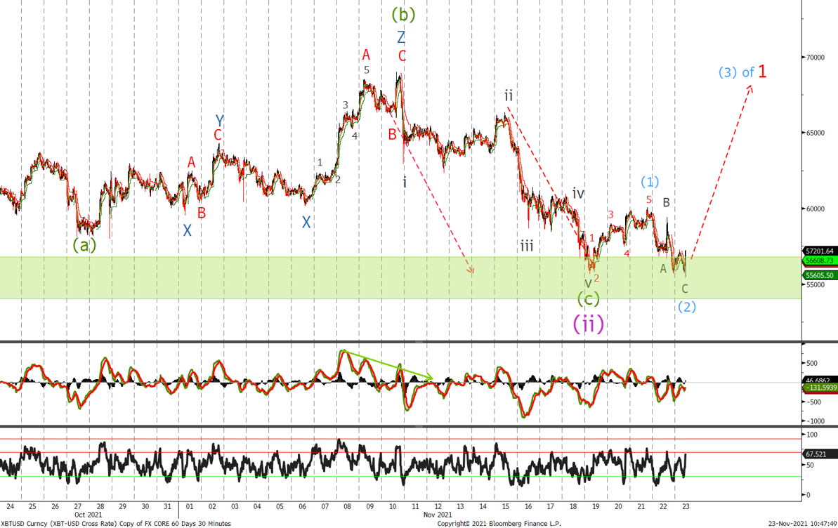 Current wave counts suggests that price will bounce again from $56k and form wave (3) upwards.