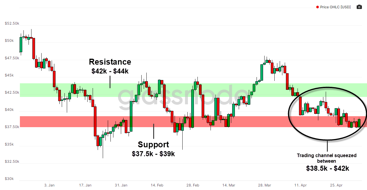 - Price has traded within a tight range of $38.5k - $42k in the last month